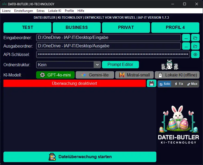Die KI-Integration kann wahlweise das GPT-4o-mini Modell von OpenAI via API-Key oder eine lokale KI-Lösung nutzen. Sobald du deinen API-Key hinterlegst, kommuniziert der DATEI-BUTLER direkt mit GPT-4o-mini und liefert dir smarte Vorschläge für Dateinamen und Ordnerstrukturen. Alternativ kannst du die Offline-KI aktivieren, um Dokumente komplett ohne Cloud-Anbindung zu verarbeiten.